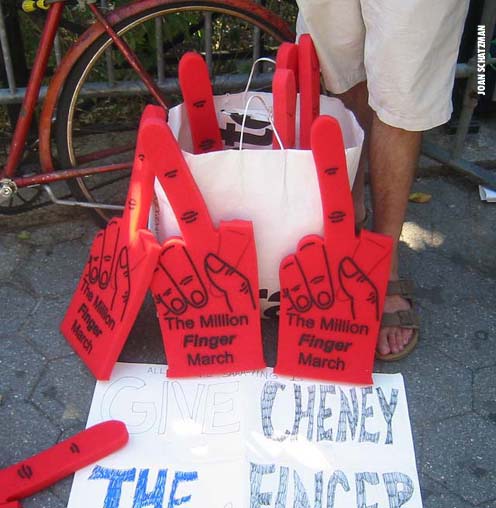 Thursday, September 2 After spending the morning nursing my feet (I was averaging about ten sidewalk miles a day), I walked to Union Square, the default place for protesters to congregate. Later on I met a friend in midtown. We wanted to go walk by the Union League on 37th and Park and see where Dick Cheney and the Poppy Bushes were staying. There was no mistaking the fact that someone important was staying there, because three very conspicuous, gas guzzling, dark-tinted windowed, black SUVs were parked out front. Next, we walked over to Macy’s hoping for Republican-delegate sightings. We walked past Madison Square Garden, but we were not allowed to linger.